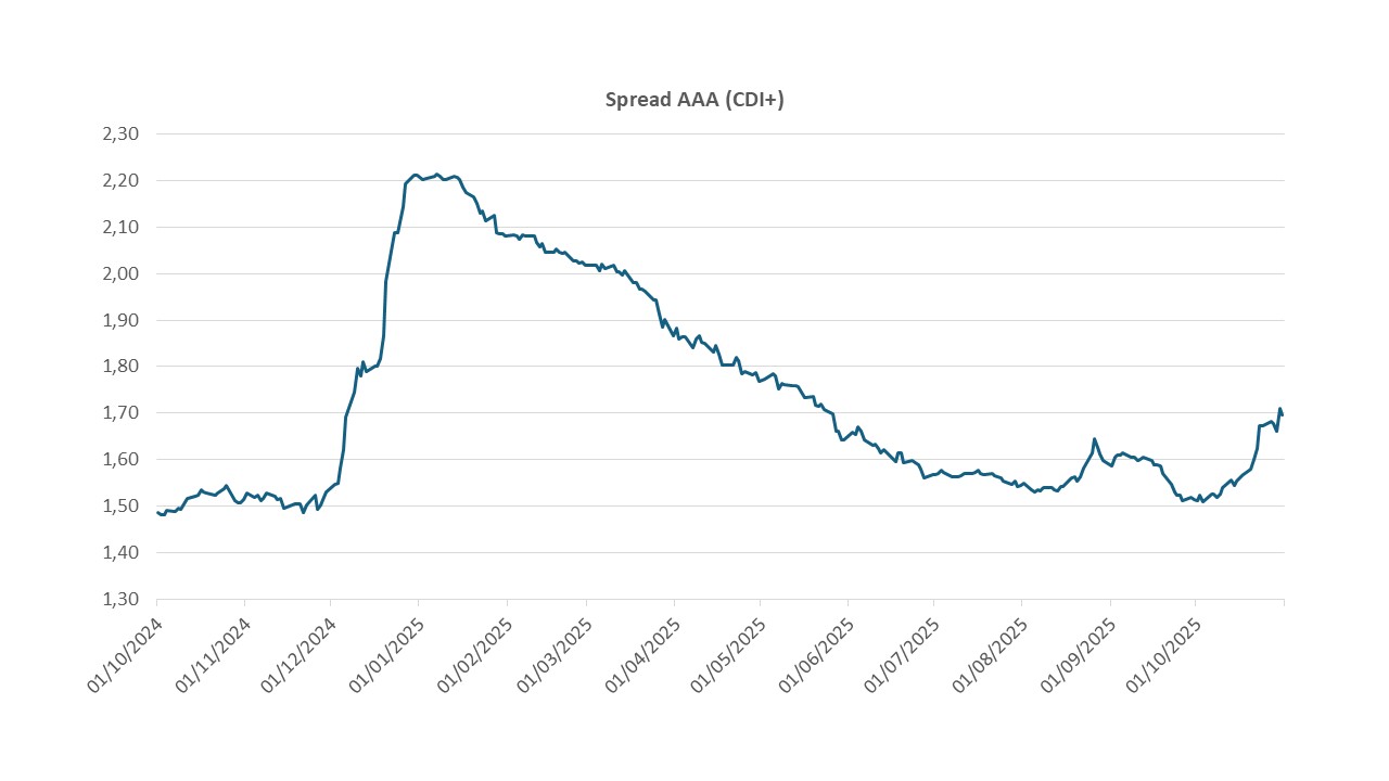 Em outubro, o mercado de crédito privado passou por uma correção técnica: depois de meses de compressão, os spreads voltaram a abrir — com maior impacto nas debêntures incentivadas. O ambiente segue de juros altos, inflação mais controlada e confiança em recuperação (a despeito dos riscos fiscais), o que mantém o apetite por crédito, ainda que com preço mais exigente.